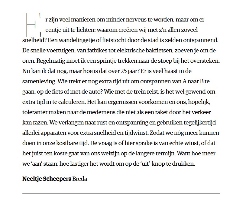 Ik mijmerde daarover toen ik vrijdagmiddag uit Goes terug naar huis fietste en talloze malen werd ingehaald door fat- en e-bikes. Ja, waarom toch al die haast? Mijn stadsfietsritjes zijn voor mij wezenlijke momenten van ontspanning. En ja, die ‘kosten tijd’, net zoals mijn treinreizen. Nou en?